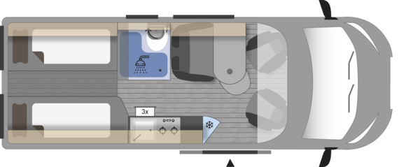 La Clever Spirit 600 es una camper amplia y funcional, tiene 4 plazas en viaje, camas traseras individuales para 2 personas, se pueden unir para 3 personas (1.94 mx 1.7m) o 4ª cama para un niño en cabina. Sus camas gemelas traseras ofrecen gran confort y versatilidad, con un interior práctico, baño completo y todo el equipamiento necesario para disfrutar de una escapada con total autonomía. Compacta por fuera, muy cómoda por dentro.