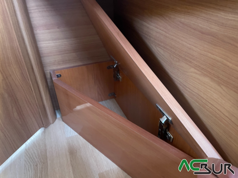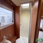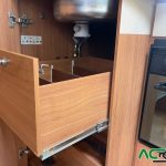 Distribuccion con cama francesa, y cama doble en cabina, baño con ducha separada, cocina en L con horno y campana extractora.