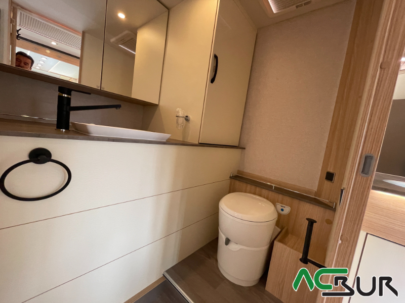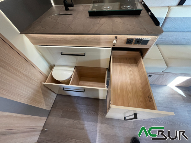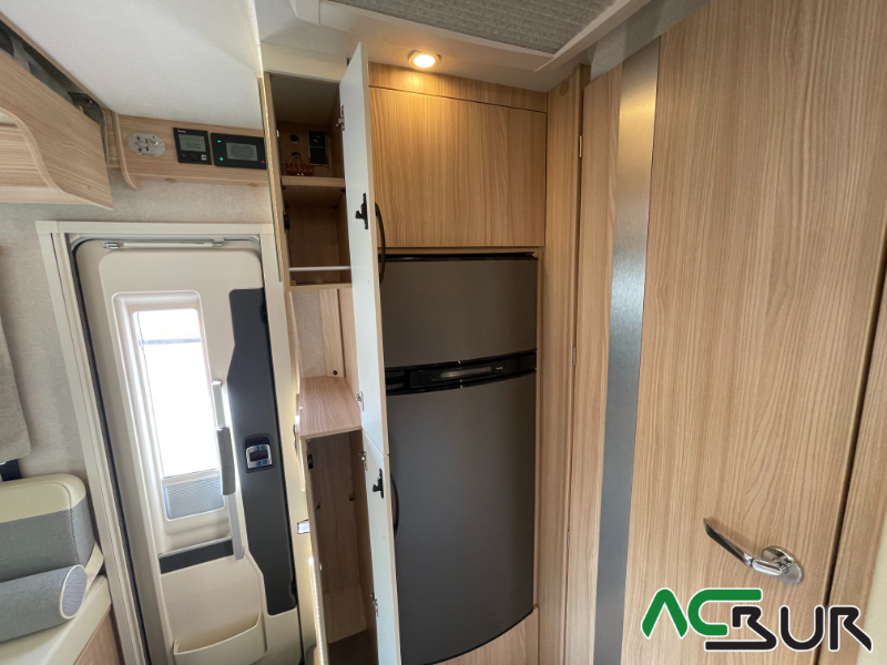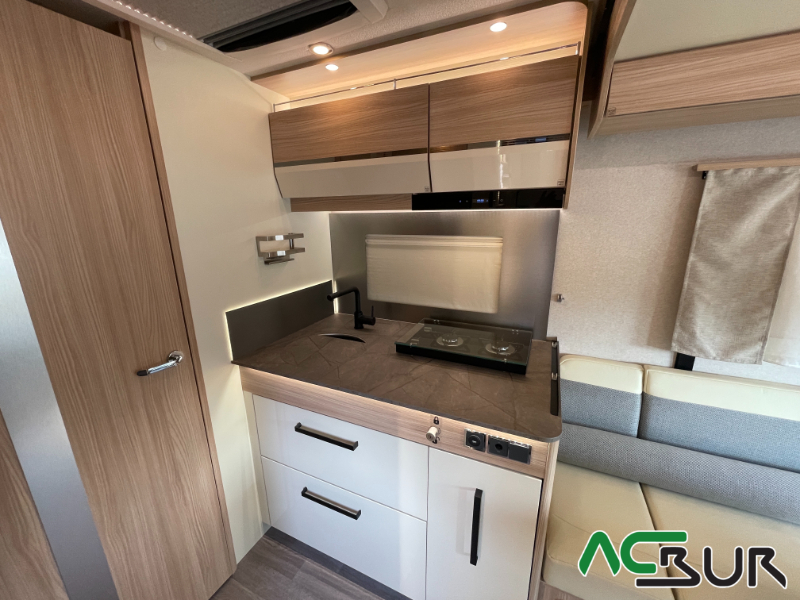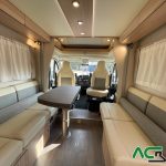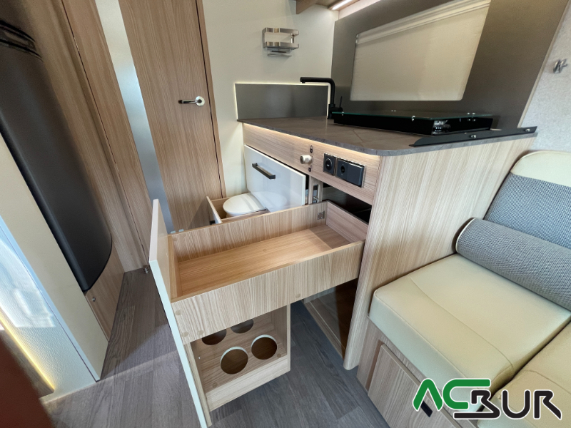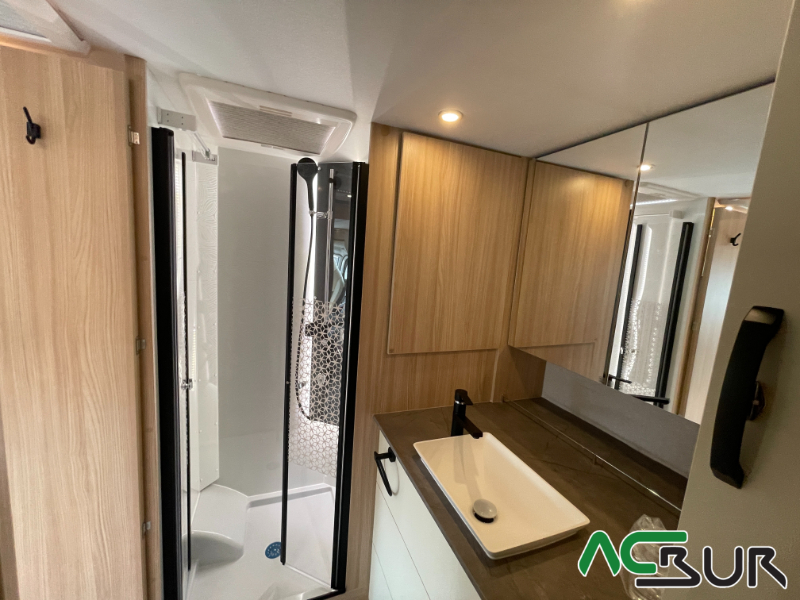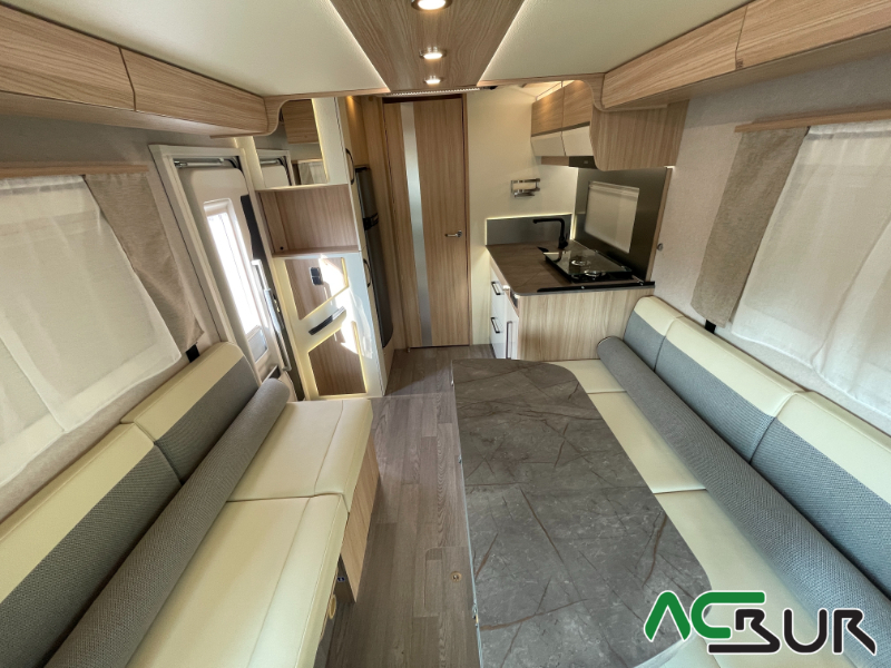 Autocaravana integral de gama alta con un amplio dormitorio, un salón face to face , una cocina con grandes cajones y un cuarto de baño con ducha separada para un movimiento fácil y funcional, gran garaje con capacidad para una moto :