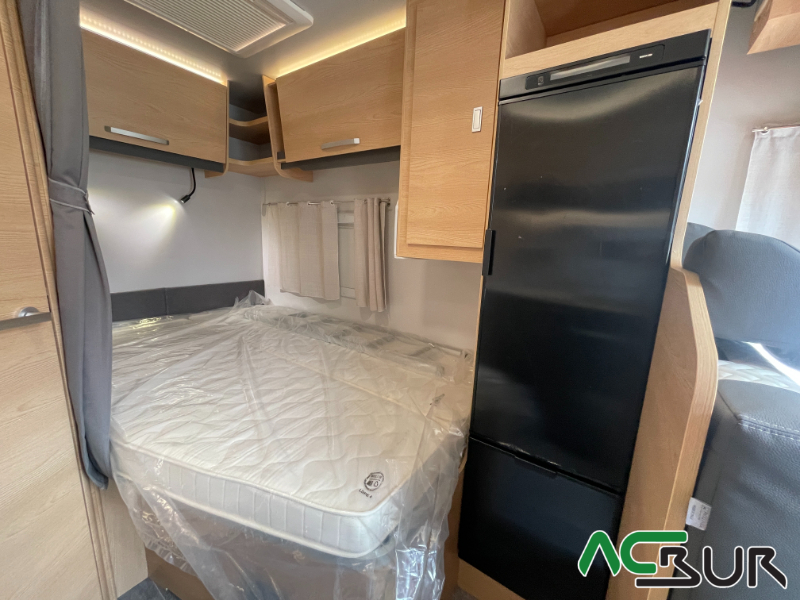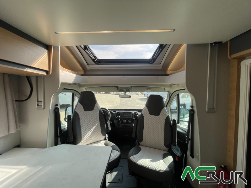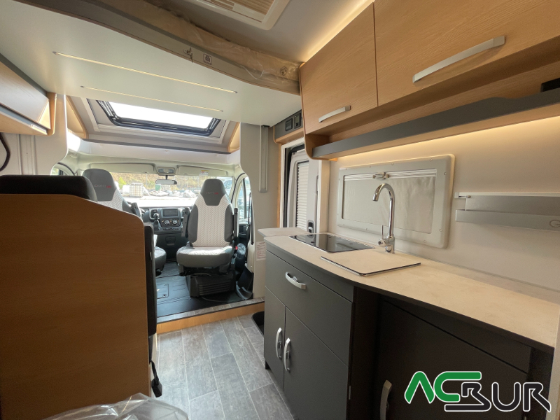 Autocaravana Perfilada  , compacta de tan solo 6 metros y capacidad para 4 personas con mucha amplitud, motor Fiat 140cv  EURO6 con cambio automatico , llantas de Aluminio, con todos las packs en la gama premier edition : maxi claraboya , retrocamra, puerta con 2 cierres y cierre centralizado, volante en cuero, pomo en cuero y faros antinieblas.Amplio salon con Smart TV 21 " y cocina en  con mucho almacenaje, cama trasera francesa con canape elevable para almacenaje y amplio salon con cama elevable.