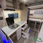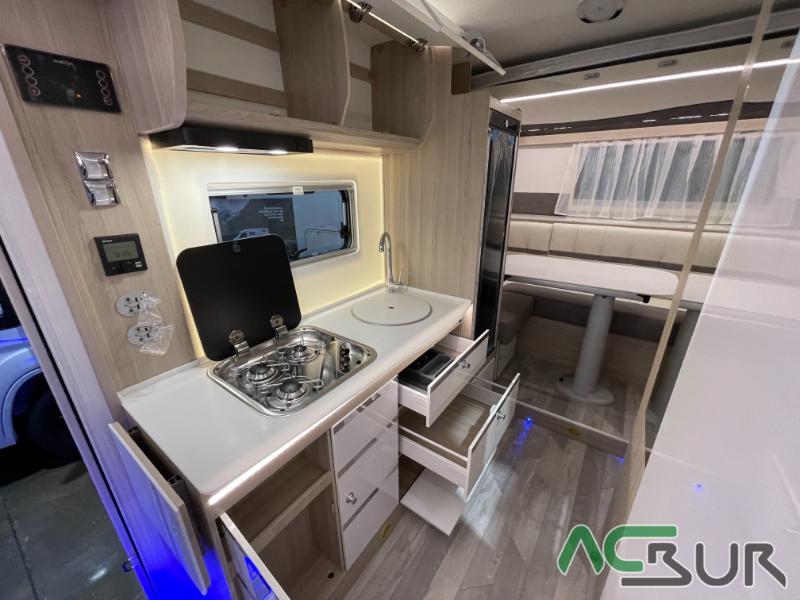 Uno de sus mayores atractivos es su cocina, muy funcional ya que dispone de una amplísima superficie de trabajo. Cuenta además con un funcional mueble bar situado detrás del asiento copiloto, para disfrutar en pareja o con amigos de una agradable sobremesa.