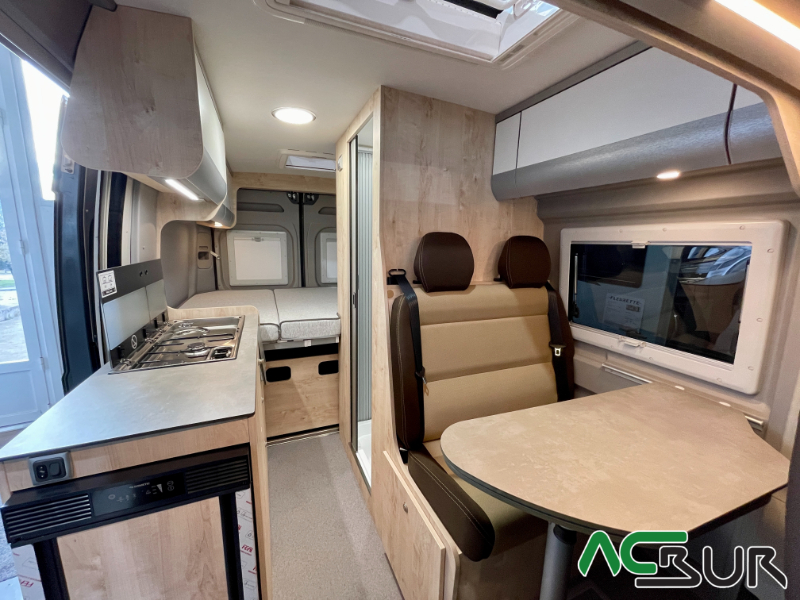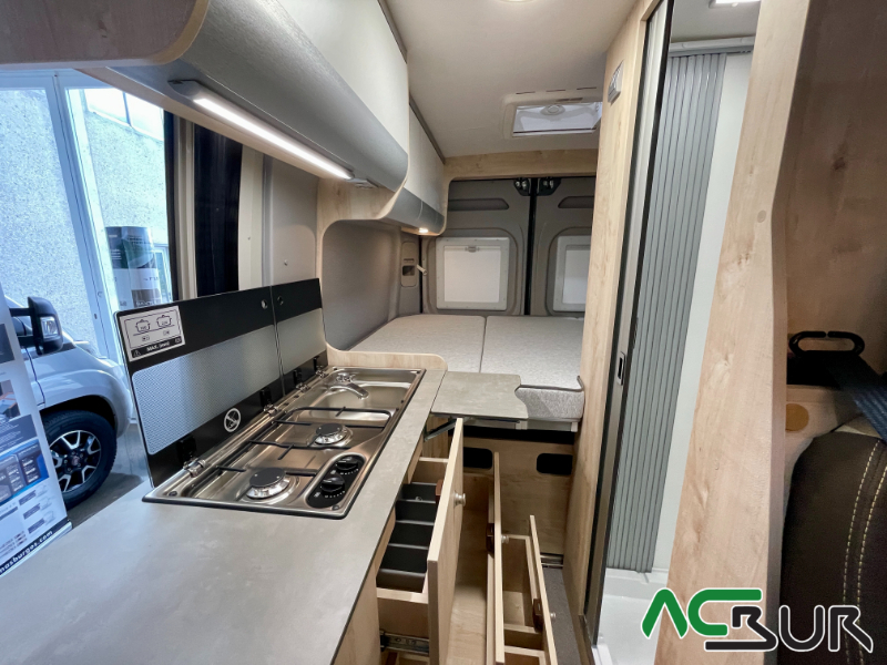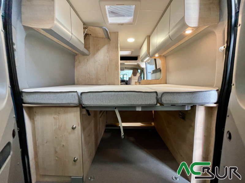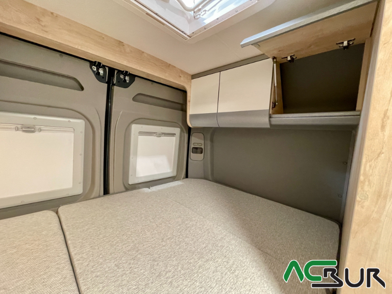 Camper 5.4 metros   , con cama  traseras transversal  , 4 plazas viajar y 3 dormir , con sistema de multimedia  , control de velocidad, aire acondicionado, sistema inteligente de traccion, motor Citroen 140cv  EURO6, con llantas de Aluminio, con todos las packs: maxi claraboya d, retrocamra . Pack Clever  que incluye:  volante en cuero, pomo en cuero y faros antinieblas.Amplio salon con Smar TV 21 " y cocina con amplia encimera   con mucho almacenaje,  y amplia capacidad de carga.