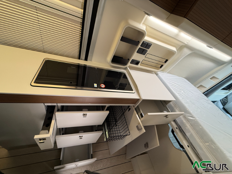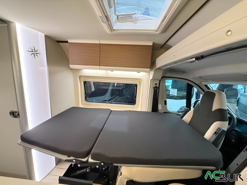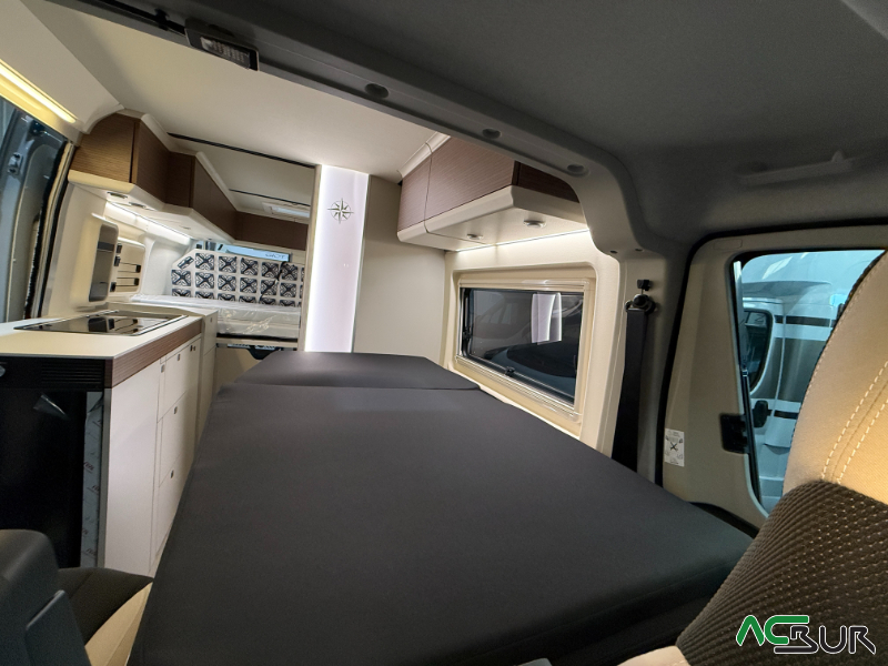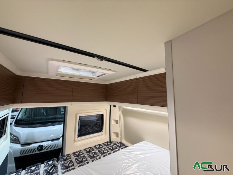 Opciones*: Techo retráctil (manual o eléctrico), banco cama plegable en dos segundos (1,80 x 0,90 m), pack de invierno con suelo radiante y plato de ducha calefactado, techo panorámico skyview, panel solar de 350 vatios para techo retráctil.