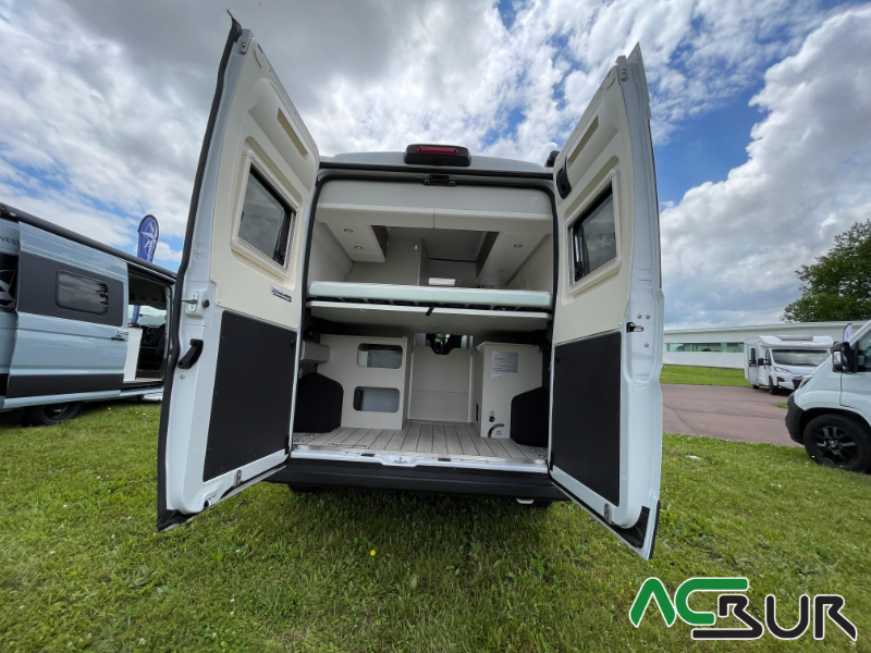 Opciones*: Techo elevable (manual o eléctrico), banco de asientos que se convierte en cama en dos segundos (1,80 x 0,90 m), paquete de invierno con calefacción por suelo radiante y plato de ducha calefactado, techo panorámico Skyview, módulo solar de 350 vatios para techo elevable.