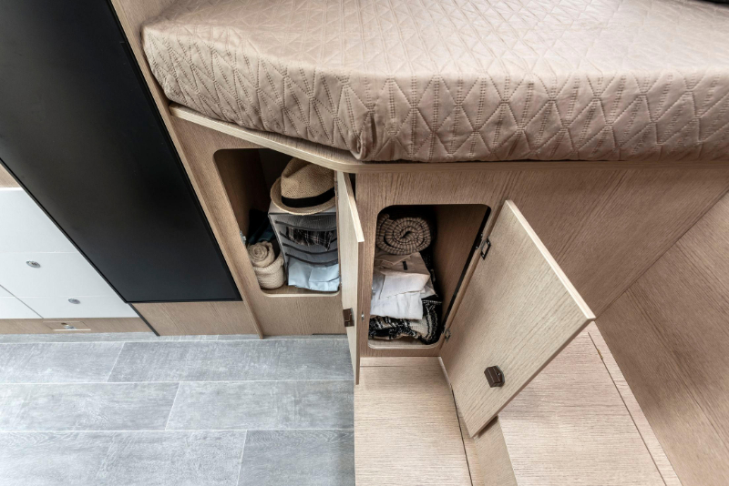 Numerosos compartimentos portaobjetos en la zona de las camas