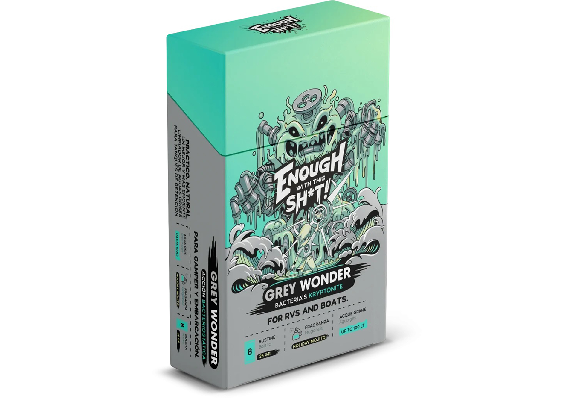 Pero no se detiene ahí. Grey Wonder es eficiente y resistente. Puede trabajar junto a otros productos de limpieza y detergentes en tu depósito, convirtiéndose en el mejor compañero de equipo. Simplemente vierte un sobre de polvo en tu fregadero, ducha o depósito, y observa cómo empieza a trabajar, tratando y desinfectando hasta 100 litros de aguas residuales.