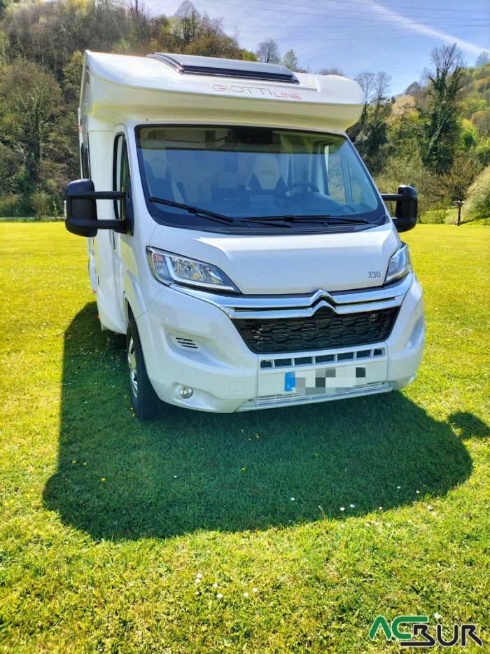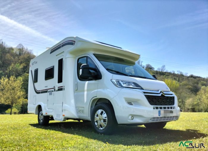 Autocaravana perfilada Siena 330 distribuccion con cama francesa trasera , baño con ducha amplia y mampara, camas traseras gemelas, cama electrica en salon, control de velocidad, aire acondicionado, sistema inteligente de traccion, motor Citroen 140cv EURO6, con llantas de Aluminio, pack privilege que incluye: retrocamara, puerta con 2 cierres y cierre centralizado, tapiceria privilege y trasera styl. Pack plus psa que incluye: sensor de luces y lluvia automaticos, volante en cuero, pomo en cuero y faros antinieblas.